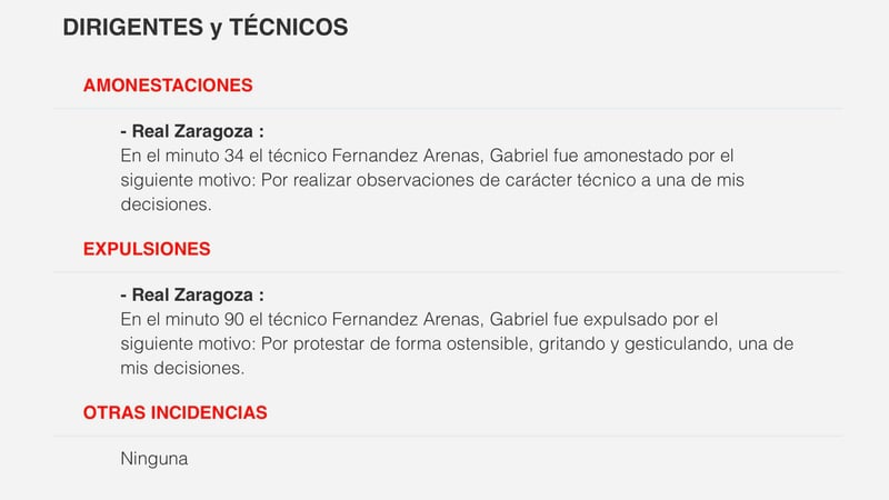 Gabi Fernández, que terminó expulsado en el tramo final del partido, habló sobre la decisión del árbitro y apeló a una patada a una botella para terminar siendo sancionado con la roja directa: "No sé qué pasa con los árbitros cuando vienen aquí, pero los que pagamos las consecuencias somos nosotros. Vosotros tenéis que tomar conclusiones. Me expulsa por darle una patada a una botella. Está mas pendiente del entrenador que del juego. No han sabido explicar la amarilla a Paul".
