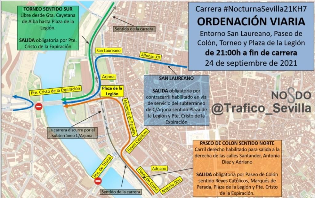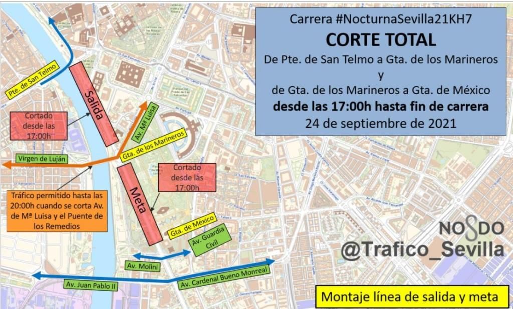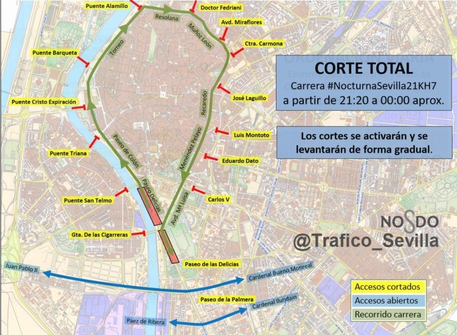 El corte total del circuito se producirá a partir de las 21:20 horas. Sucederá de forma progresiva y gradual, activándose con la previsión del paso de los corredores hasta el final de la carrera, quedando el circuito encapsulado. No se permitirá el acceso del tráfico rodado desde Paseo de las Delicias, puentes de San Telmo, Triana, Cristo de la Expiración, Barqueta, Alamillo, Fedriani, Carretera de Carmona, Laguillo, Luis Montoto, Eduardo Dato, Carlos V y Paseo de las Delicias.