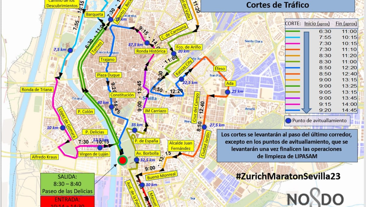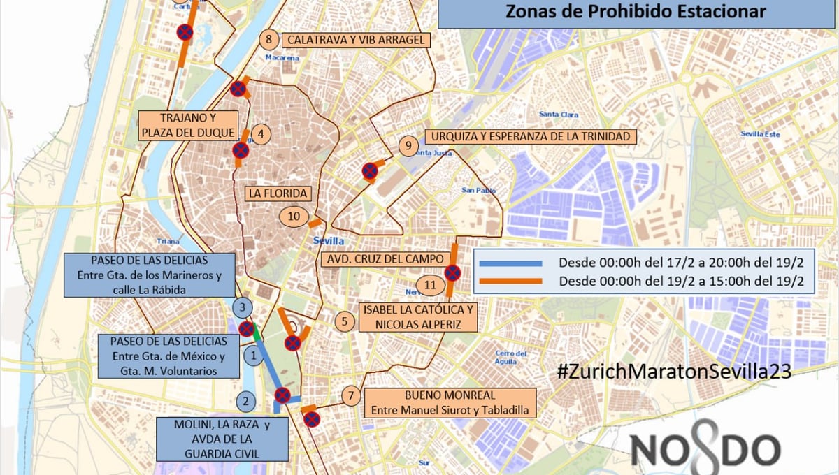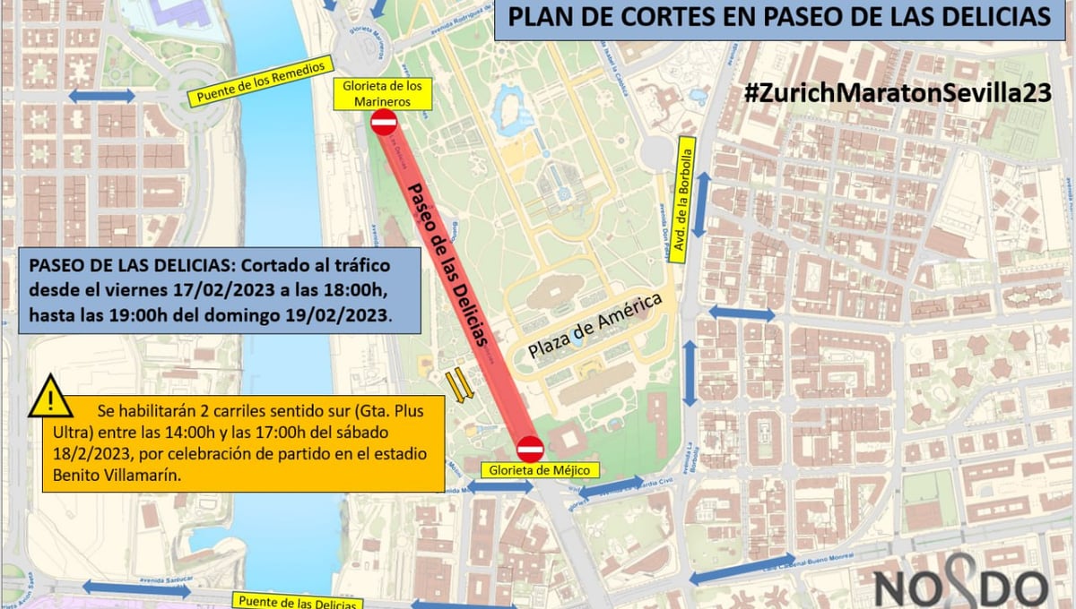 El Ayuntamiento de Sevilla, a través del Área de Movilidad en coordinación con la empresa Tussam y el Instituto Municipal de Deportes (IMD), ha diseñado un plan de tráfico especial para este fin de semana para la celebración del Zurich Maratón Sevilla y ofrecer alternativas a los accesos y salidas del Estadio Benito Villamarín el sábado con motivo del corte total a la circulación del Paseo de las Delicias desde mañana por la tarde para el montaje de las distintas estructuras necesarias para la prueba deportiva, que será la más internacional y con mayor repercusión mediática e impacto económico de las 37 ediciones –la de 2023 es la 38– que se han celebrado hasta ahora.