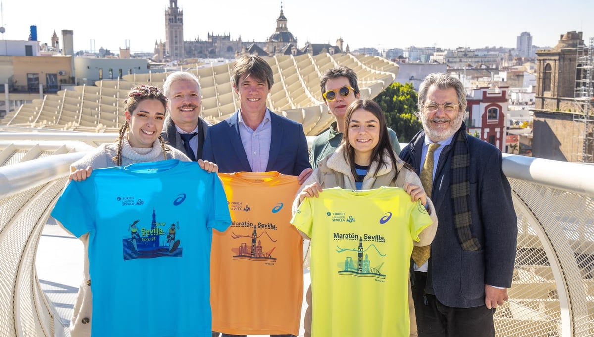 La presentación de las camisetas oficiales se ha llevado a cabo por parte del delegado de Transición Ecológica y Deportes del Ayuntamiento de Sevilla, David Guevara; junto a Javier Gavela, director técnico del Zurich Maratón de Sevilla; Sebastián Ballester, responsable de ASICS; y las diseñadoras de las camisetas del maratón y el 5K Breakfast Run, Mª Paz García y Paula Pérez.
