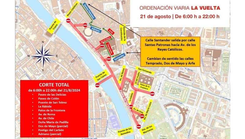 Con Primoz Rogliz portando el maillot rojo de líder de la Vuelta 2024, el pelotón tiene estimada su llegada a Sevilla poco después de las 17:00 horas y, si las previsiones son acertadas, en torno a las 17:20 llegará a meta, que está situada en el Paseo Cristóbal Colón. Pero antes vivirá un amplio recorrido a la capital hispalense, que tendrá cortadas muchas vías principales, de ahí que se haya querido alertar, tanto a los que quieren ver el paso de la Vuelta como a los que necesitan desplazarse dentro de la ciudad.