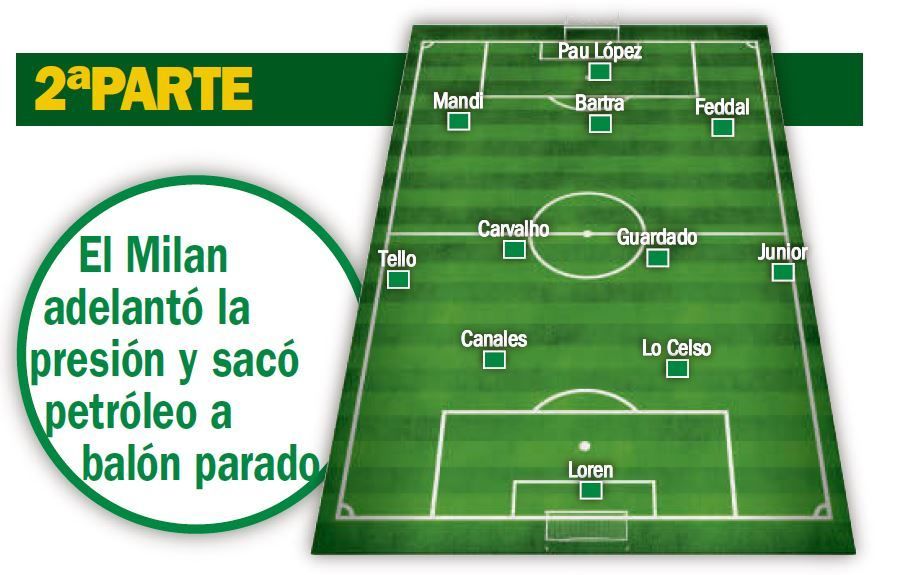 Tras el paso por los vestuarios, el Milan reaccionó -lógico por otra parte- y adelantó la presión. Fue entonces cuando al Betis le costó tener la pelota y, sin ella, se desconectó y lo pagó con el empate. Emergió el Betis en la recta final ante un Milan desfondado, pero ambos terminaron dando por bueno un empate que en el Betis sabe a poco y que deja con la sensación de no haber sabido rematar una faena que comenzó en San Siro.