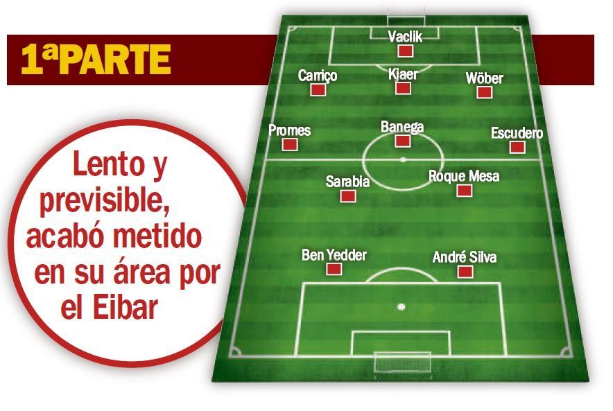 El Eibar supo atacar los puntos débiles de un equipo que presentaba dos novedades en el once, Wöber en lugar de Sergi Gómez y Roque Mesa por Franco Vázquez. Machín mantuvo su hoja de ruta ante un cuadro armero que le ganaba en intensidad, frescura y velocidad. Con una presión inteligente en los primeros metros, entorpecía la salida de balón de un Sevilla predecible, que buscaba a André Silva con balones en largo intentando superar la tela de araña en la que se convertía la defensa eibarresa.
