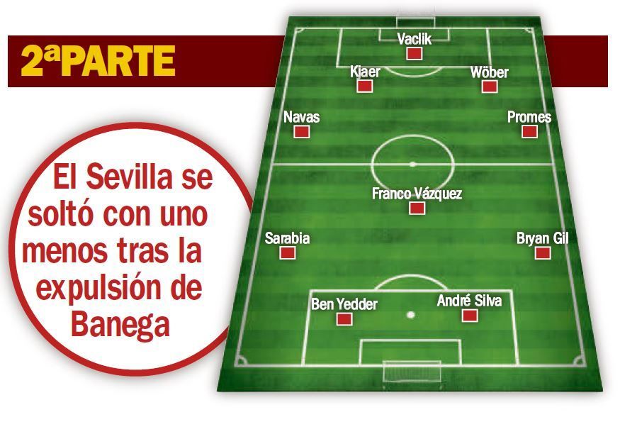 Y por el centro, escaseaban también las ideas con un Banega como máximo exponente del bloqueo sevillista. Su expulsión era sintomática... y fue, a la postre, decisiva, porque obligó al equipo a abrirse y buscar soluciones verticales por las bandas, donde se mostraban determinantes Promes, Navas, Bryan Gil y sobre todo Sarabia -que dio el primero y firmó el segundo-.