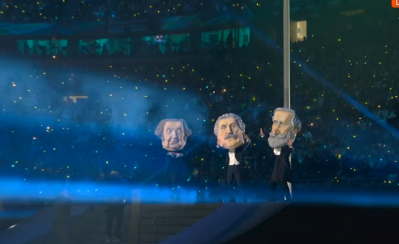 La intensidad aumenta cuando el trío de cabezudos reaparece, entregándose a una coreografía cargada de energía al son de la melodía de Milano y Cortina, que recuerda bastante a la canción Vamos a la playa de los italianos Righeira