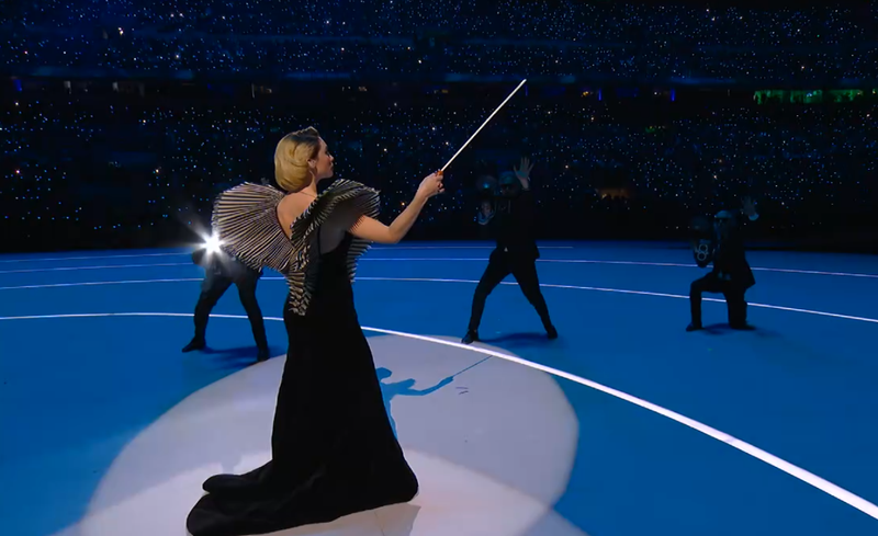 Con la representación de Verdi, Puccini y Rossini presidiendo la escena, la intensidad aumenta por momentos. En el centro de este torbellino, una directora de orquesta -representando a Raffaella Carrá- marca el compás a los bailarines que la rodean.