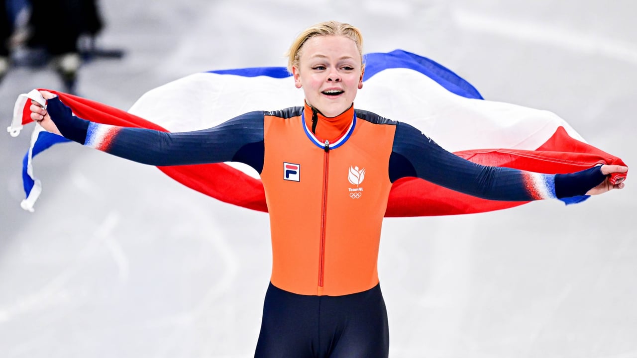 Xandra Velzeboer celebra con la bandera de Países Bajos tras proclamarse campeona olímpica en Milano Cortina 2026.IMAGO