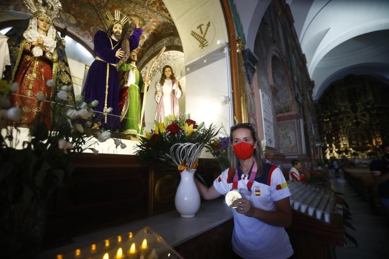 Escoltada por un grupo de moteros ha seguido hasta el Ayuntamiento, en la Plaza de la Constitución, donde le esperaba la pancarta para la campeona, el 'We are the champions' y el himno nacional como preludio al agasajo institucional que implica toda medalla olímpica.