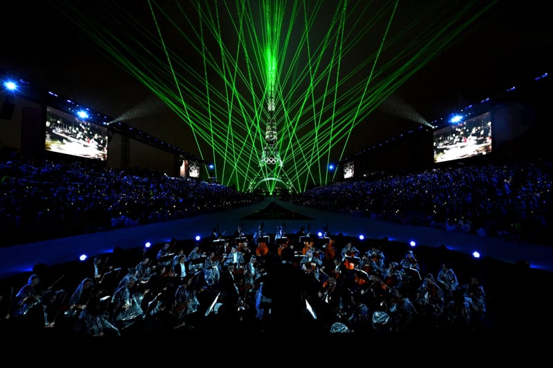La Torre Eiffel es el centro de un espectáculo de luces y efectos visuales para poner el colofón a esta ceremonia, pasada por agua
