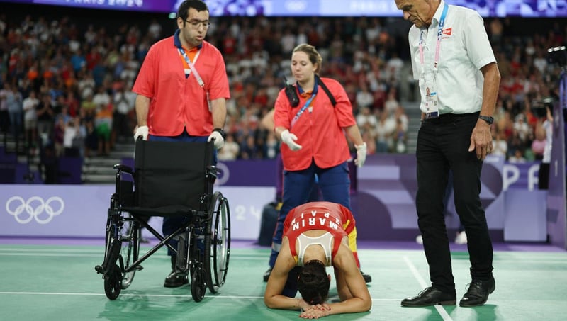 Tal vez haya salido la imagen más desgarradora de los Juegos Olímpicos y no sólo por lo que se perdía. Carolina Marín acariciaba una nueva final olímpica en París 2024, la segunda de su carrera, vencía con cierta comodidad su segundo set ante la china He Bing Jiao después de haber ganado el primero cuando sucedió la tragedia.