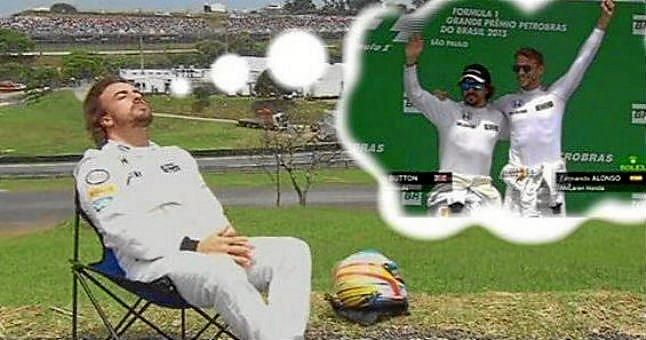Con los Mundiales, de pilotos y constructores, ya más que decididos, Alonso fue uno de los protagonistas de la semana en Brasil. El viernes, obligado a retirarse con su MP4-30 ardiendo, se sentó en una barrera del trazado en una imagen que muchos calificaron de desesperación. Sin embargo, en un nuevo abandono en la calificación, el asturiano decidió sentarse tranquilamente a tomar el sol y después se hizo una foto simbólica en el pódium brasileño.
