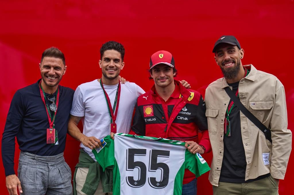 Las redes sociales fueron testigos del empeño de Joaquín Sánchez, Marc Bartra y Borja Iglesias de teñir de verdiblanco el característico color rojo de la escudería Ferrari. Los tres futbolistas del Betis posaron junto al piloto madrileño Carlos Sainz, a quien regalaron una camiseta del equipo heliopolitano con el dorsal 55, que es el que luce el bólido del español y a quienes agradecieron la invitación, hecha pública por la propia empresa italiana.