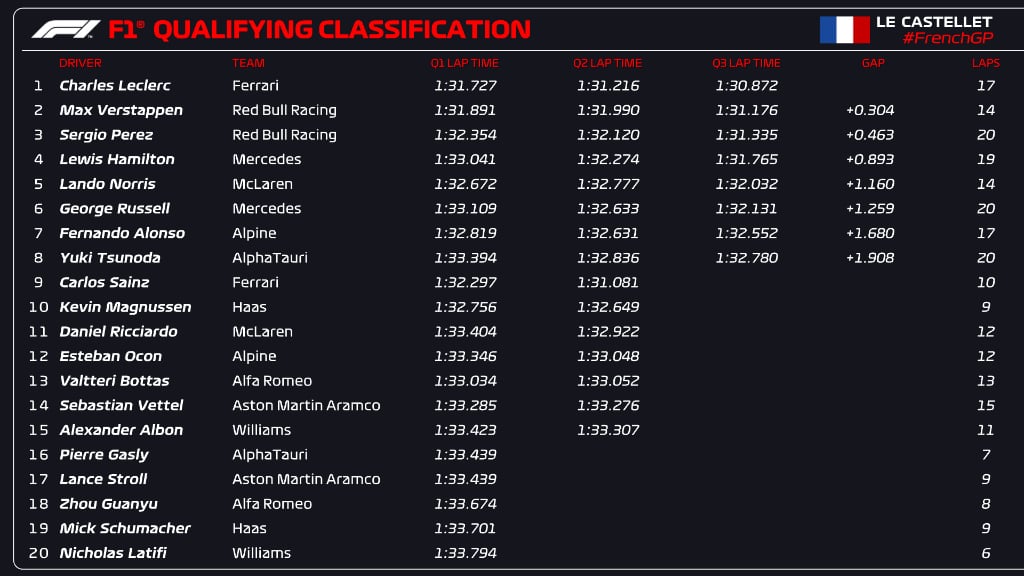 El monegasco Charles Leclerc (Ferrari) saldrá primero este domingo en el Gran Premio de Francia, el duodécimo del Mundial de Fórmula Uno, que se disputa en el circuito Paul Ricard de Le Castellet; donde el mexicano Sergio Pérez (Red Bull) arrancará tercero y el español Fernando Alonso (Alpine) lo hará desde la séptima plaza.