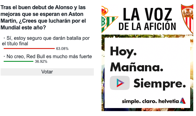 Así, al menos, lo consideran la mayoría de los encuestados por ESTADIO Deportivo, siendo algo más del 63% de los participantes los que están “seguro” de que Alonso y su Aston Martin “darán batalla por el título final”. El casi 37% restante, en cambio, no lo tienen tan claro, considerando que todavía “Red Bull es mucho más fuerte” que la escudería británica de Alonso y Stroll.