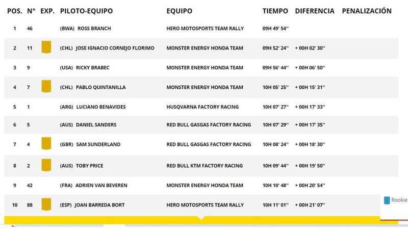 Con eso, la general queda encabezada por Branch, que aventaja en 2 minutos y 55 segundos a Cornejo y en 6,50 al estadounidense Ricky Bravec. Quintanilla y Luciano Benavides cierran las cinco primeras posiciones.