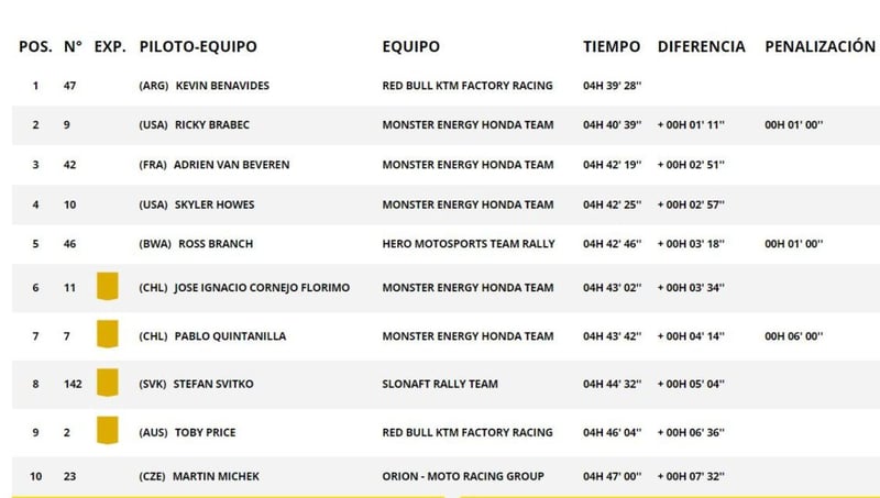 La alegría de Barreda y Quintanilla duró dos horas, porque luego, el español sería nuevamente sancionado, como el día anterior. Tanto él como el ganador de la etapa, el chileno Quintanilla. Dos radares pillaron con exceso de velocidad tanto a Barreda, que tuvo doce minutos de sanción por pasar a 85 y a 98 km/h en dos tramos en los que debía ir a 30 km/h, como al piloto chileno, al que le han caído seis minutos de penalización por pasar a 84 km/h en una zona de 30 km/h. Con esto el vigente campeón de motos, el argentino Kevin Benavides, que había sido tercero, se hacía con la etapa.
