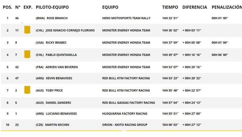 En esa general, el piloto de Bostbwana aventaja en 3 minutos y 11 segundos a un Nacho Cornejo que, tras las sanciones, acabó sexto la etapa tercera etapa; y a 5 minutos y ocho segundos al estadounidense Bravec. Pablo Quintanilla ya es cuarto, pero a más de 16 minutos y Van Beveren quinto... Todos ellos menos Branch llevan la potente Honda del equipo Monster Energy.