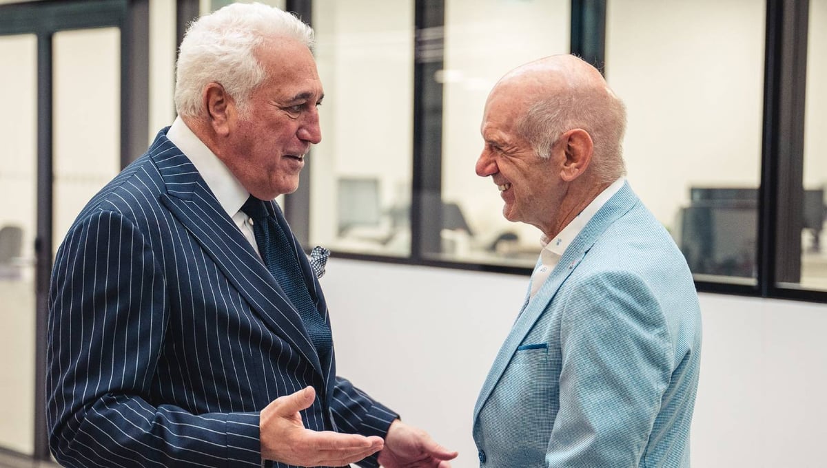 Adrian Newey, conversando con Lawrence Stroll durante su presentación en Aston Martin.@AstonMartin