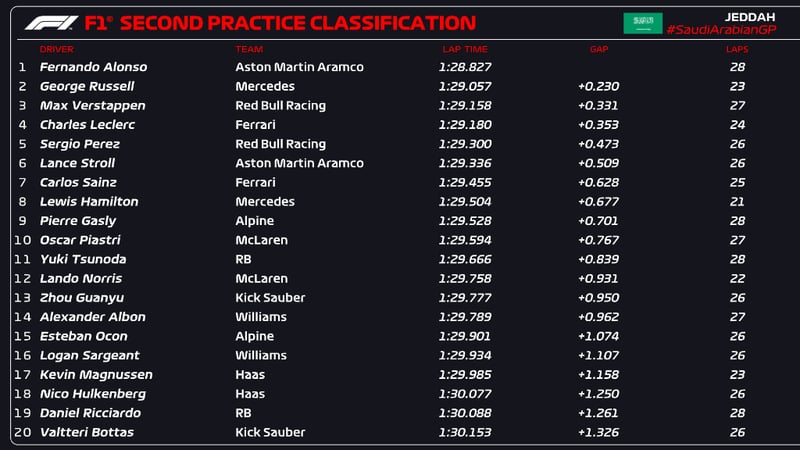 La gran noticia en este primer día del Gran Premio de Arabia Saudí es el rendimiento de Aston Martin. La escudería británica se mostró cauta antes de la segunda cita del Mundial de Fórmula 1, pero ello no ha evitado que la ilusión se haya disparado tras ver a Fernando Alonso hacer el mejor tiempo de los segundos entrenamientos libres en Jeddah, dejando dos décimas atrás al Mercedes de George Russell y hasta tres al Red Bull de Max Verstappen.