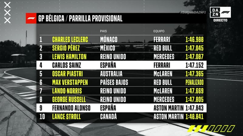 Esta es la parrilla provisional... los diez primeros colocados en esta última carrera del Mundial de Fórmula 1 antes del parón... Carlos Sainz sale cuarto y Fernando Alonso, noveno. No es la primera vez que se ve al nano hacer magia con los adelantamientos... ¿Conseguirá llegar al podio?