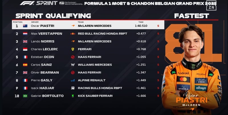 Mañana habrá Carrera Sprint y será la segunda vez que en el Gran premio de Bélgica se dispute bajo dicho formato. El primero, y único de ellos, fue en el 2023, año en el que Max Verstappen dominó la temporada de principio a fin. En ese sentido, fue el neerlandés quien se quedó con el crono más rápido del fin de semana, con Oscar Piastri y Carlos Sainz cerrando el podio