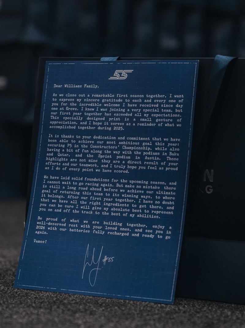"Querida familia Williams. Al cerrar una primera temporada extraordinaria juntos, quiero expresar mi más sincera gratitud a todos y cada uno de vosotros por la increíble bienvenida que he recibido desde el primer día en Grove. Sabía que me unía a un equipo muy especial, pero nuestro primer año juntos ha superado todas mis expectativas". Esta impresión especialmente diseñada es un pequeño gesto de agradecimiento, y espero que sirva como recordatorio de lo que hemos logrado juntos durante 2025".