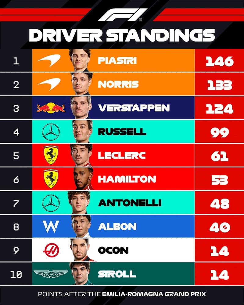Pese a que no pudo mantener la primera plaza más allá de la primera curva en el trazado de Imola, el australiano Oscar Piastri sigue liderando con 146 puntos la tabla del Mundial de Pilotos, secundado por su compañero Lando Norris, que está a trece puntos de distancia. Mientras, el tetracampeón del mundo y vencedor del Gran Premio de la Emilia-Romagna, Max Verstappen, se mantiene tercero pero le ha recortado esta semana puntos a ambos pilotos de McLaren. Y, además, se ha distanciado aún más de Russell, piloto de Mercedes.