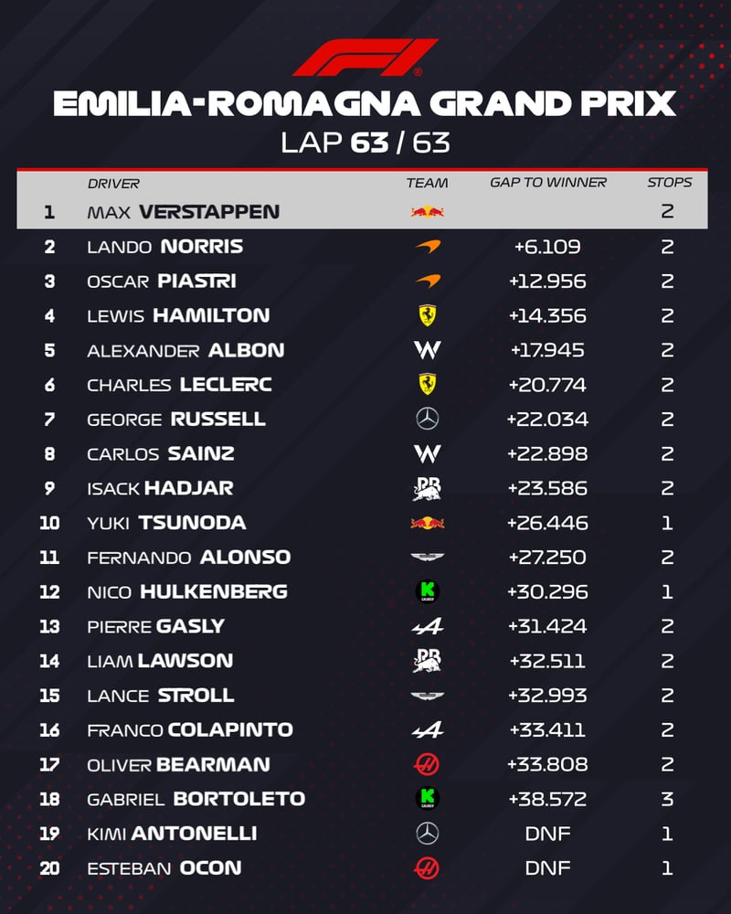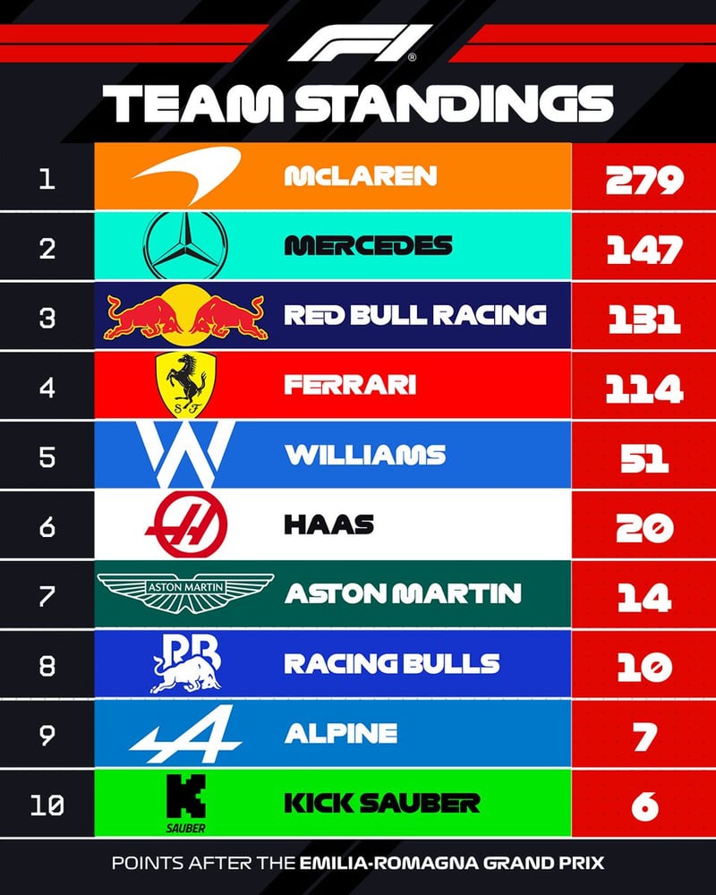 De igual modo, McLaren sigue dominando con una clara superioridad el Mundial de Constructores gracias al buen hacer de sus dos pilotos, que de nuevo volvieron a subirse al podio. Mercedes, pese a la retirada en Imola de Kimi Antonelli, continúa luchando por este título muy de cerca, al tiempo que Red Bull ocupa la tercera plaza gracias a la segunda victoria de Verstappen en la presente temporada.