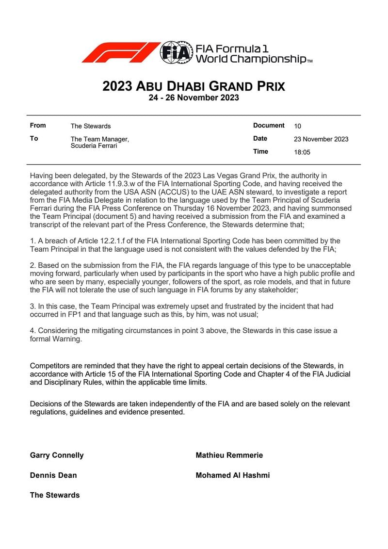 Tal cual suena. Lejos de admitir su error, desde la FIA enviaron un comunicado a la escudería italiana en el que le advertían por el lenguaje usado en sus declaraciones, recalcando que no tolerarían algo similar en el futuro. He aquí el documento emitido entonces.