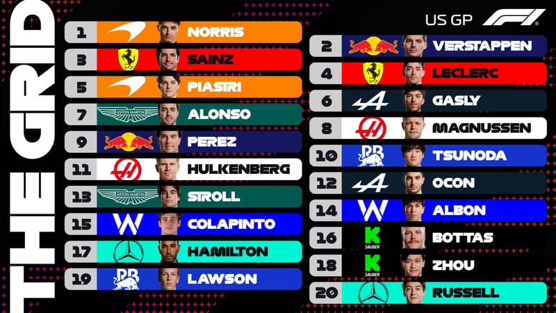 Con la última modificación -Russell sale último-, así queda la parilla de salida en el circuito de Las Américas, en el que Fernando Alonso saldrá por la parte limpia y en el que lo que ocurra al principio puede ser clave en el resto de la prueba