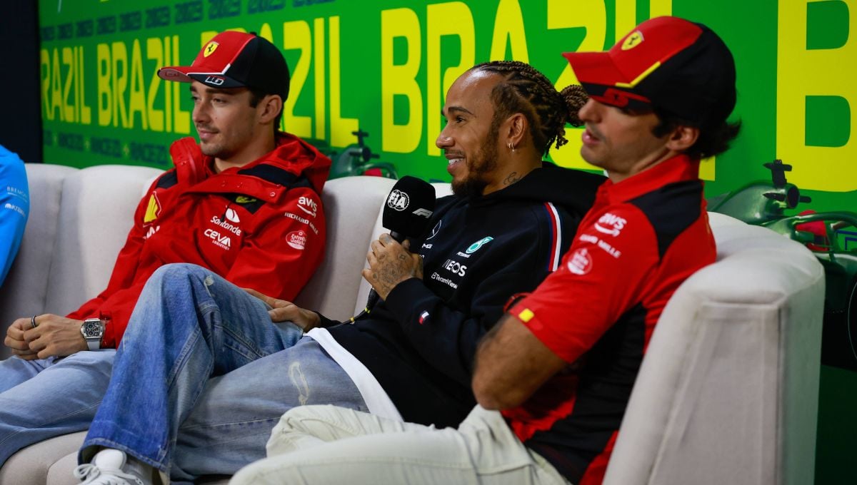Lewis Hamilton, entre Sainz y Leclerc, los pilotos de Ferrari.Cordon Press