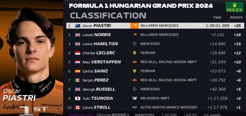 El australiano Oscar Piastri (McLaren) se aprovechó de la lucha por el Mundial entre su compañero de equipo, el británico Lando Norris (McLaren), y el neerlandés Max Verstappen (Red Bull) para ganar el GP de Hungría y sellar su primer triunfo en F1, aunque para ello tuvo que esperar a dos vueltas del final, cuando Norris dio su brazo a torcer y cedió la primera posición a su compañero.