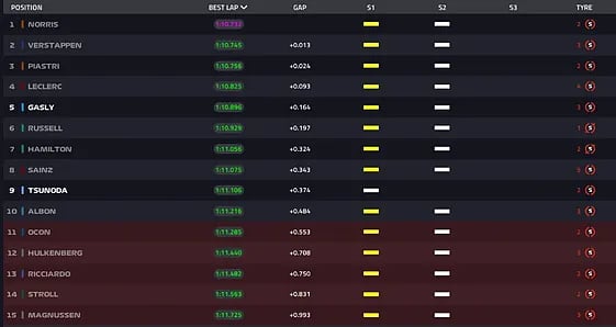 Norris, Verstappen, Piastri, Leclerc, Gasly, Russell, Hamilton, Sainz, Tsunoda y Albon pasan a la Q3.