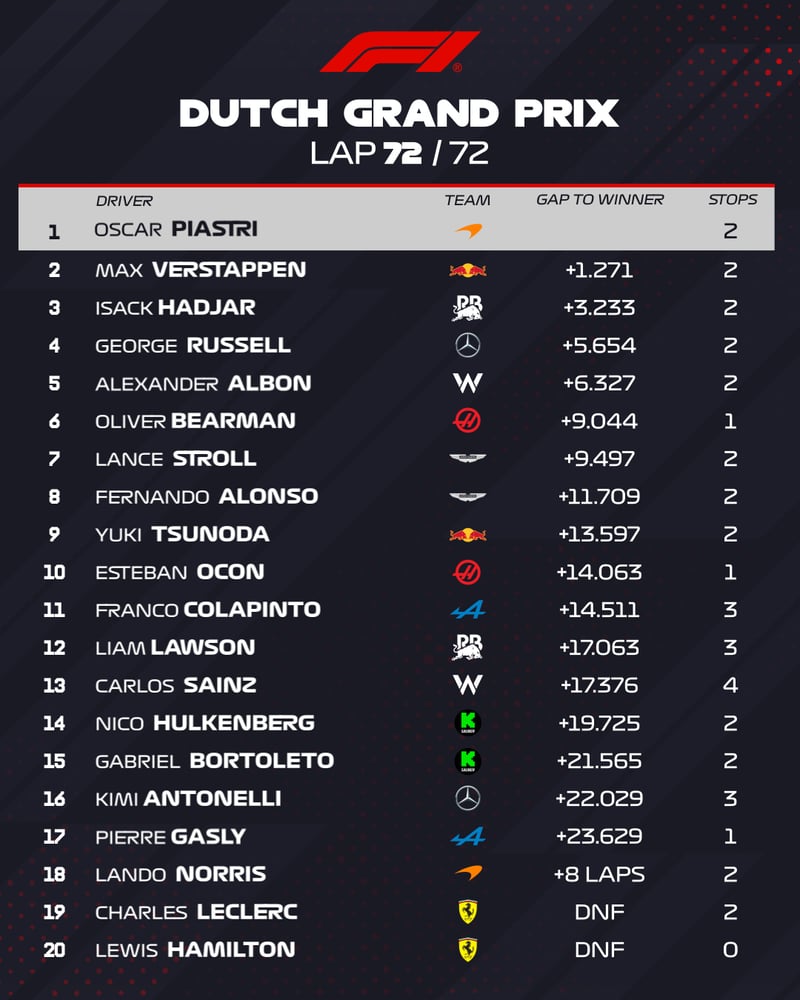 F1 GP de Países Bajos 2025, Piastri gana el Gran Premio de Fórmula 1, clasificación y tiempos
