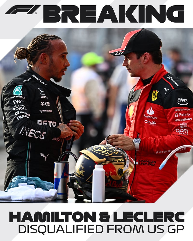 Una vez finalizada la carrera del Gran Premio de Estados Unidos, disputada en el circuito de Las Américas de Austin, la FIA anunció la descalificación de Lewis Hamilton y Charles Leclerc como consecuencia de una inspección aleatoria llevada a cabo en sus monoplazas. El equipo técnico detectó irregularidades en el desgaste de las tablas situadas en la parte inferior de ambos coches, no cumpliendo con el Artículo 3.5.9 del Reglamento Técnico de Fórmula Uno 2023. Al perder la segunda y sexta plaza, respectivamente, el resto de pilotos ganaron un puesto en la clasificación final, quedando Noriss segundo y siendo Checo Pérez quinto.