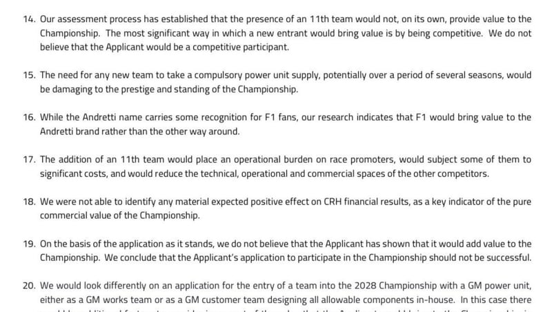 Los argumentos, además, dejan en mal lugar a Andretti, ya que no sólo cree que sería incapaz de construir un coche competitivo para la F1, sino que, además, consideran que no aportaría valor a la competición y sí se aprovecharía de ella para ganar notoriedad. "No creemos que el solicitante vaya a ser un participante competitivo” ni pueden "identificar ningún efecto positivo material esperado en los resultados financieros de CRH", afirman desde la F1. Además, añaden, que 'perjudicaría' a los otros diez equipos, ya que "reduciría" sus "espacios técnicos, operativos y comerciales", y provocaría más costes y una mayor carga operativa entre los promotores de carreras.