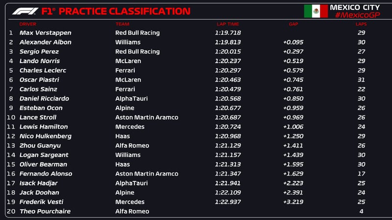El holandés Verstappen sigue a lo suyo y marcó el mejor tiempo y además lo hizo los tres compuestos del neumático Pirelli que testó en el circuito de los hermanos Rodríguez durante la primera hora de los entrenamientos. Terminó la sesión con un tiempo de 1:19.718. Por detrás sorprendió el Williams de Alex Albon, al que favorecen las condiciones de la pista. Paró el crono con 1:19.813. El tercero fue el piloto que corre en casa, 'Checo' Pérez, que finalizó en 1:20.015.