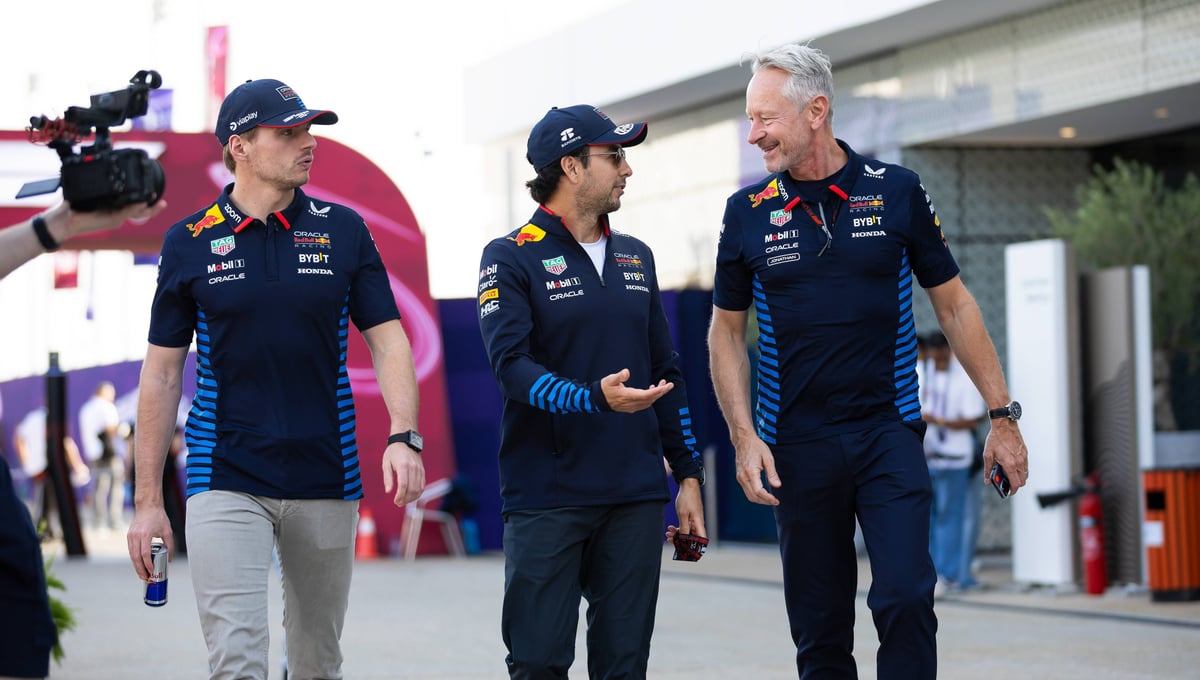 Jonathan Wheatley charlando con 'Checo' Pérez y Max VerstappenCordon Press
