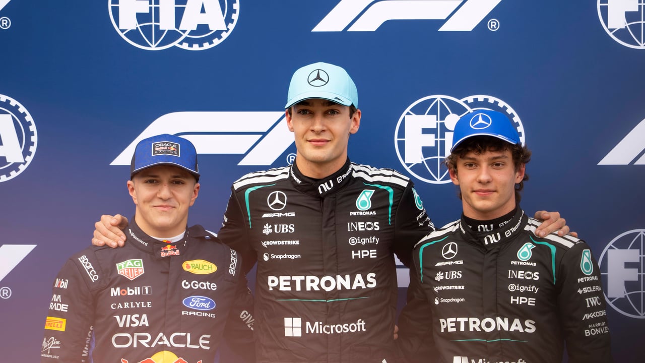 Hadjar, Russell y Kimi Antonelli, en el podio de la clasificaciónImago