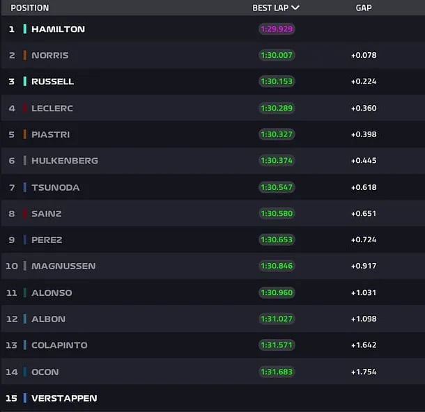 Max Verstappen se intercala entre los McLaren, mientras que Lewis Hamilton sube hasta la cuarta plana. George Russell, en una vuelta no muy buena, se queda séptimo.
