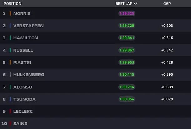 ¡Lando Norris se pone primero! Aunque Leclerc ha hecho un primer tiempo muy similar al británico. Y Fernando Alonso sigue sin salir...