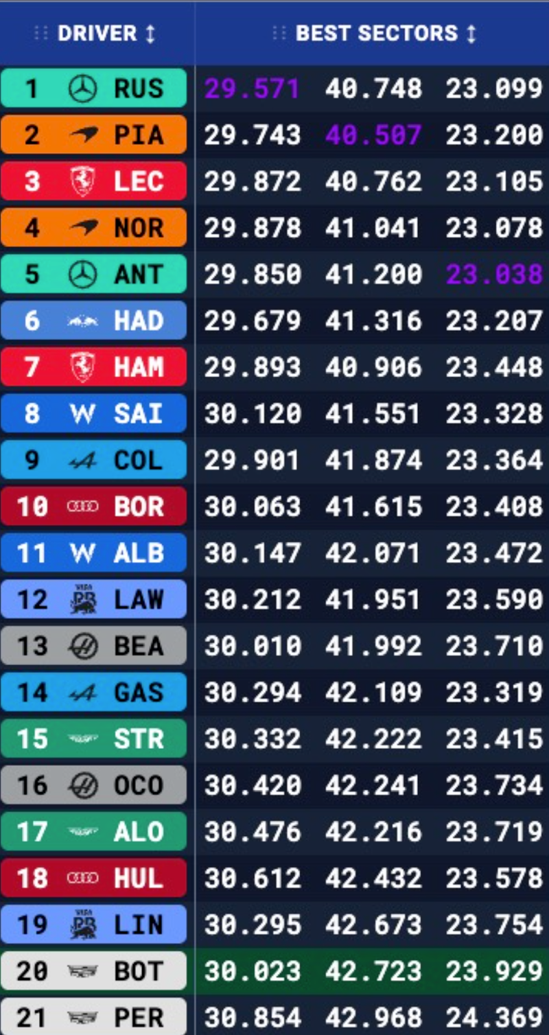 George Russell se cuela en el quinteto de cabeza tras registrar un 1:34.588, quedándose a apenas 0.012 del crono de su antiguo compañero Lewis Hamilton y a ocho décimas de Charles Leclerc. De este modo, las seis primeras plazas se las reparten Ferrari, Mercedes y McLaren, al tiempo que la pareja de Alpine se asienta en el octavo y noveno lugar