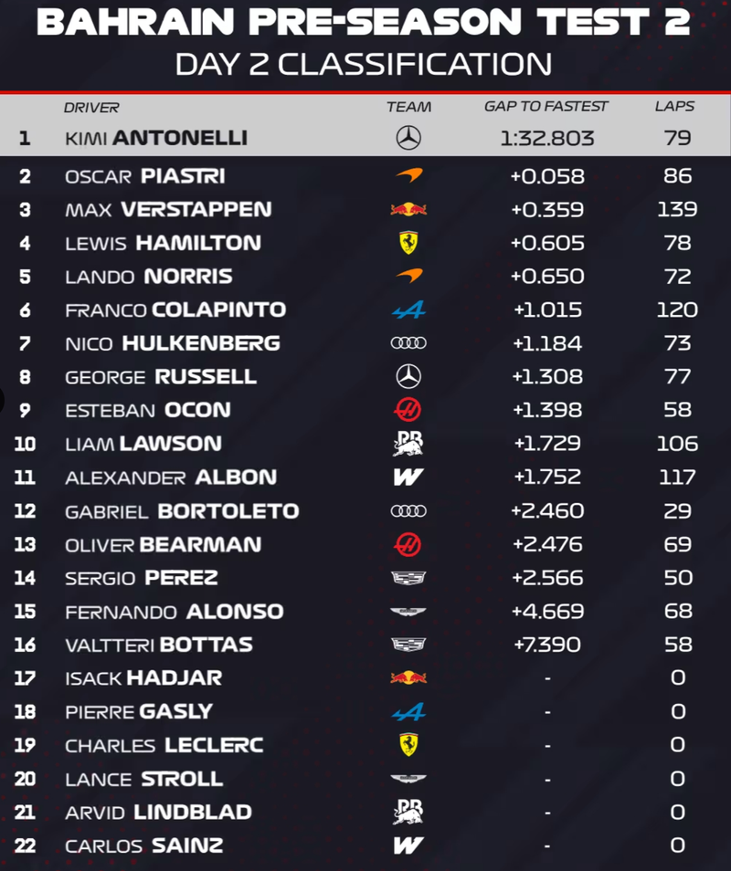 Mientras que Aston Martin fue el equipo menos fiable del día, McLaren y Ferrari va haciendo las con buena letra, siendo el segundo mejor tiempo el de Oscar Piastri con el McLaren. Eso sí, a Mercedes no hay quien le eche un pulso todavía, siendo de nuevo la mejor máquina de estos test.
