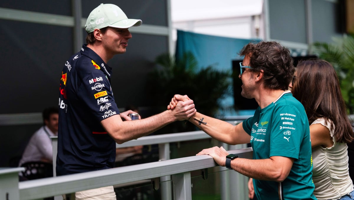 Verstappen y Fernando Alonso, saludándose en Miami. Cordon Press