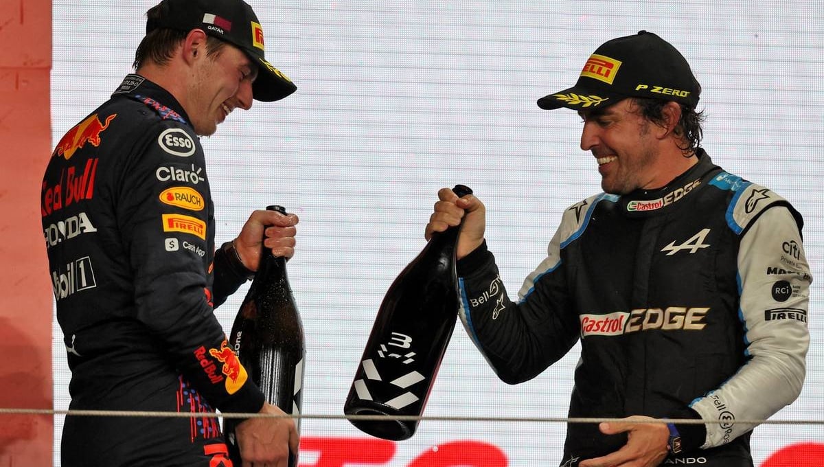 Verstappen y Alonso celebrando en el podio. X Fórmula Uno