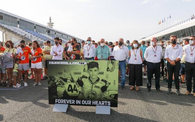 La jornada dominical daba comienzo con los warm up para cada categoría. Una vez concluidos, toda la colonia del FIM CEV Repsol, Dorna, RFME, Circuito de Jerez-Ángel Nieto y autoridades locales, se sumaban en la línea de meta junto a la familia del piloto, al emotivo minuto de silencio en memoria del joven onubense Hugo Millán, fallecido en accidente durante el transcurso de la carrera de la categoría Hawkers European Talent Cup en la anterior cita celebrada en Motorland Aragón.