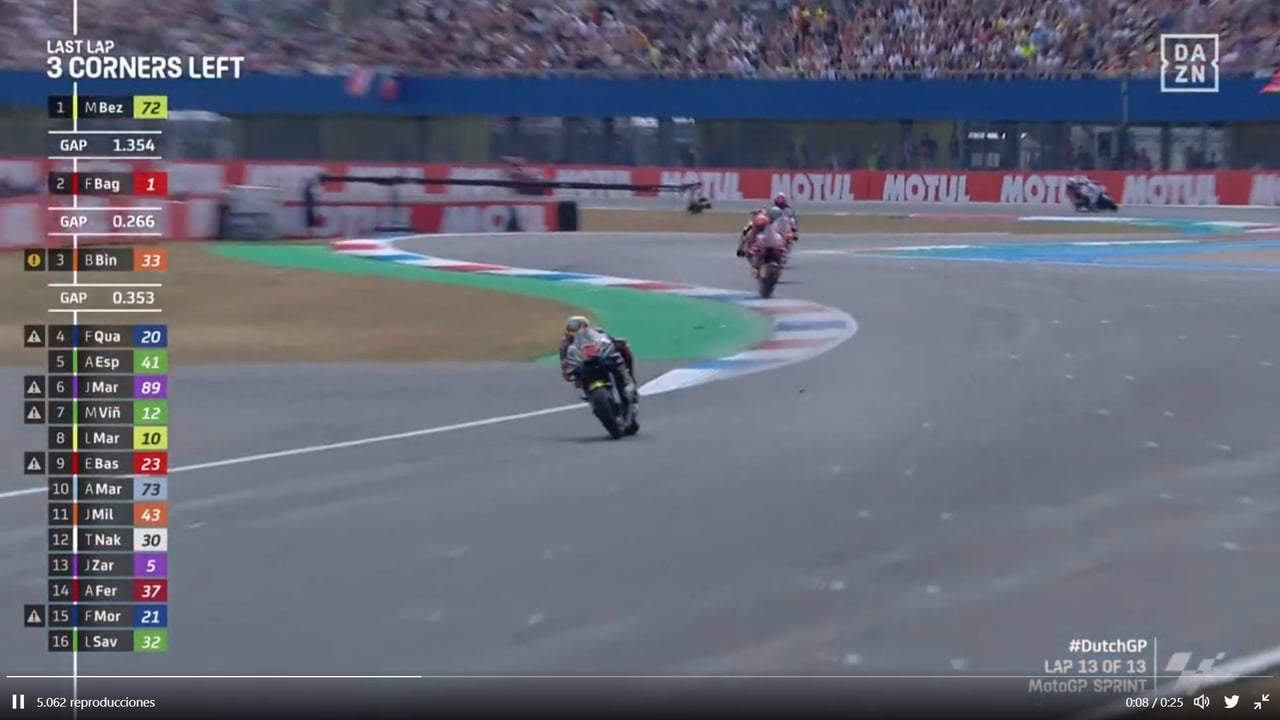 Con el pasar de los metros, Jorge Martin también fue perdiendo fuerza respecto al dúo que peleaba por la primera posición: Bezzecchi y Bagnaia. También con el trío que seguía la estela de ambos (Brad Binder, Fabio Quartararo y Aleix Espargaró). En los últimos compases Binder fue sancionado por la vuelta larga, como no pudo cumplirla, la sanción quedó en pasar del tercer al quinto puesto.