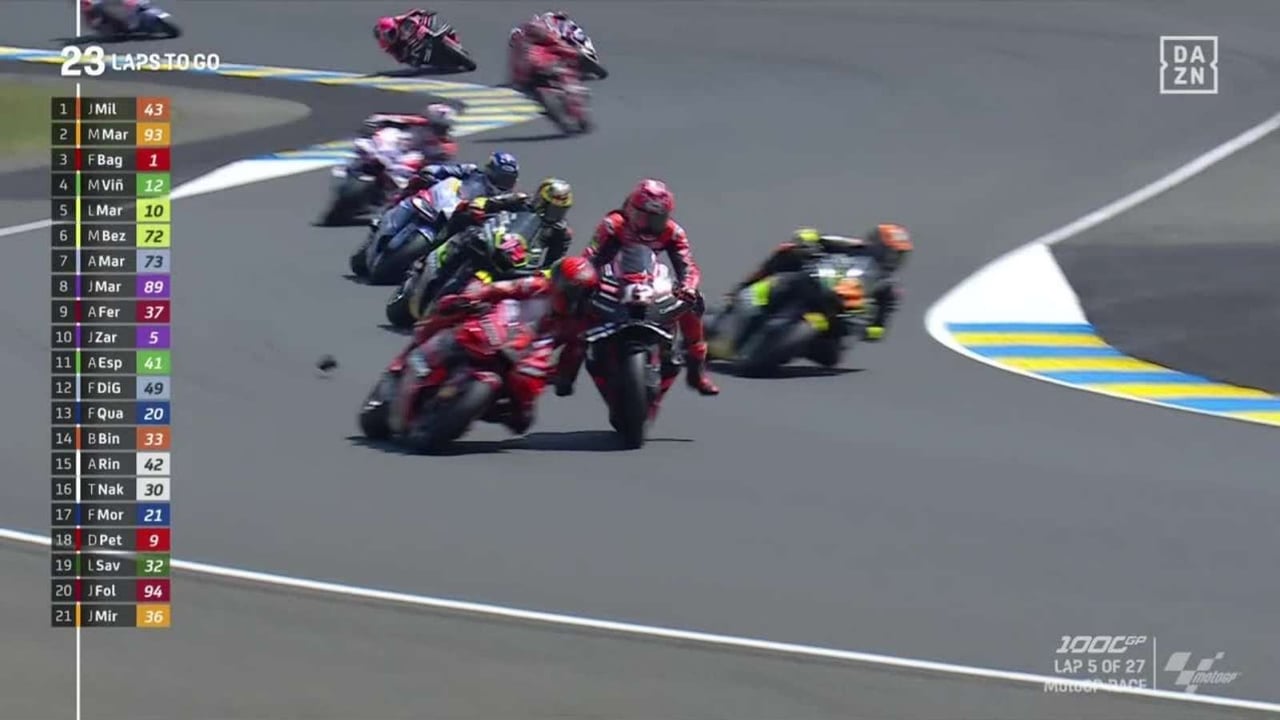 Un incidente de carrera, con 23 vueltas que restaban todavía por disputar, en el que no se puede determinar con facilidad de quién fue la culpa. Sin duda, es un golpe duro para el actual campeón del mundo, Bagnaia, que podría haberse escapado en la clasificación del mundial de MotoGP, y que ahora corre el riesgo de ceder el liderato de nuevo a Marco Bezzecchi.