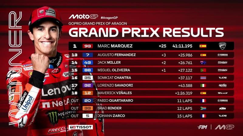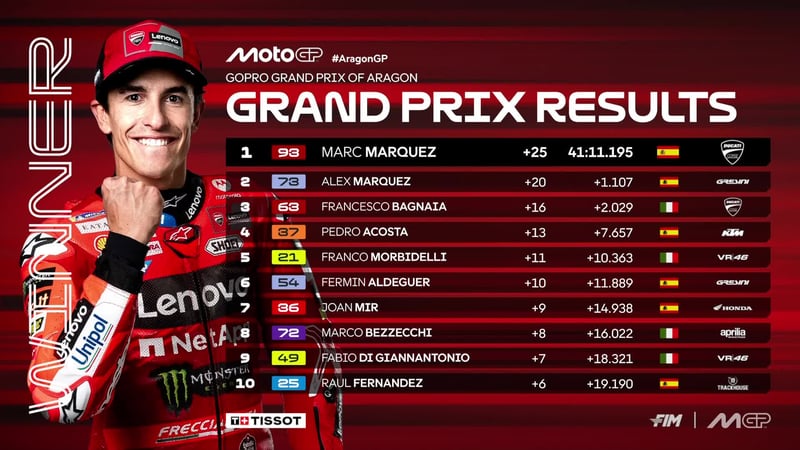 GP de Aragón 2025 de MotoGP, Marc Márquez gana en MotorLand, clasificación y tiempos