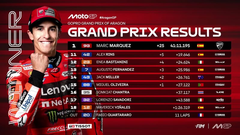 Márquez, que dominó desde la primera hasta la última vuelta de carrera, y desde el primer entrenamiento del fin de semana turolense, suma 233 puntos, 32 más que su hermano Alex Márquez (Ducati Desmosedici GP24), que fue segundo, con el italiano Francesco 'Pecco' Bagnaia (Ducati Desmosedici GP25), tercero, a 93 puntos del líder.